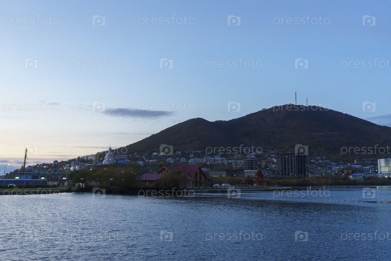 Городской пейзаж с видом на озеро и горы. Петропавловск-Камчатский