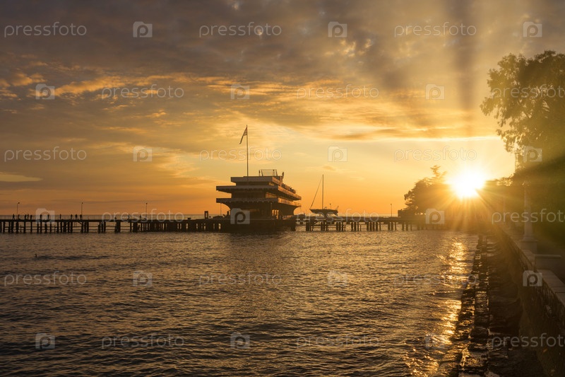 Морской порт исторический курортный город в лучах заходящего солнца, отражающегося в море