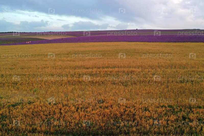 Вид с воздуха на поля пшеницы и лаванды. Крым