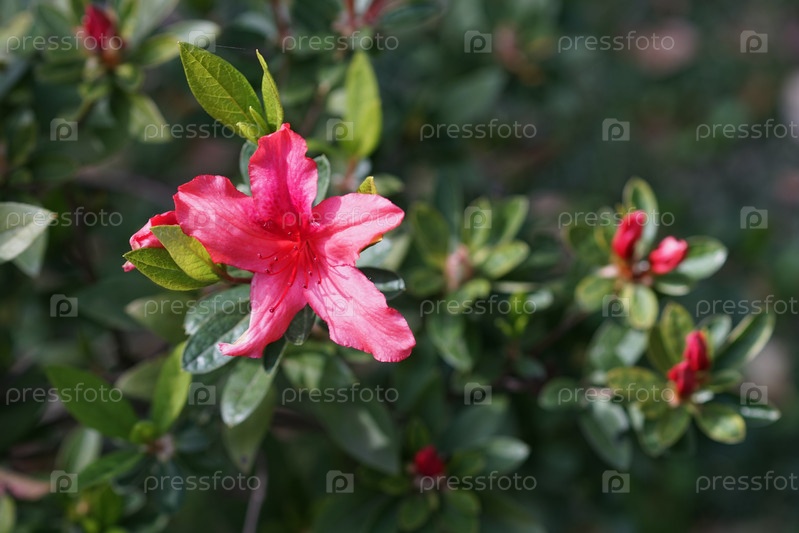 Цветы рододендрона розового цвета на фоне темно-зеленой листвы