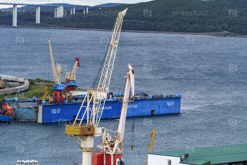 Владивосток, Россия-23 сентября 2021 г.: Морской пейзаж с видом на плавучий док