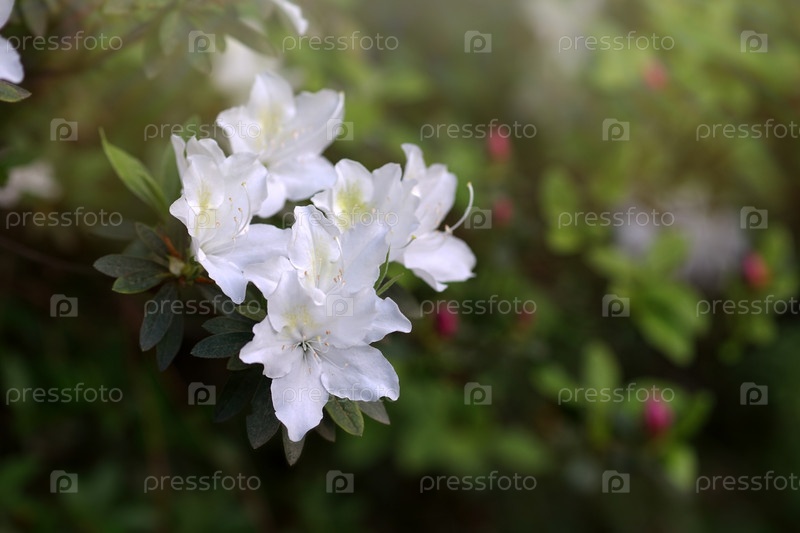 Белые цветы рододендрона на размытом фоне