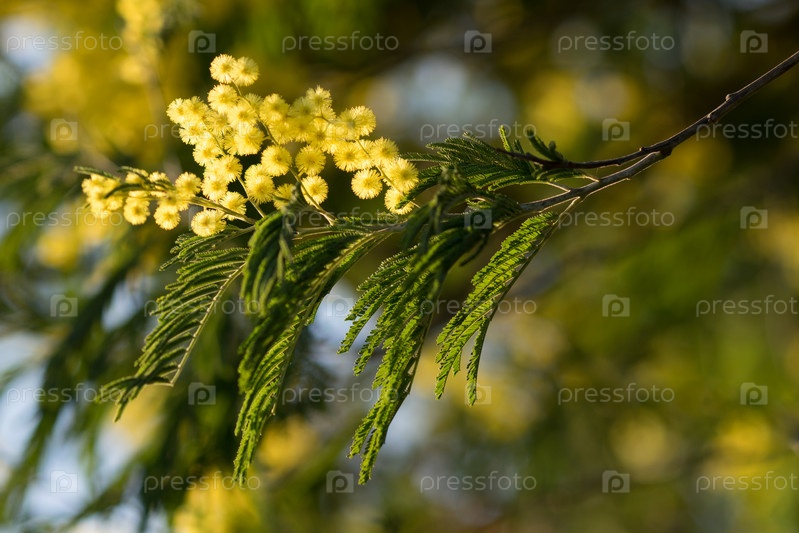 Желтые пушистые цветы серебристой акации среди зеленых ветвей
