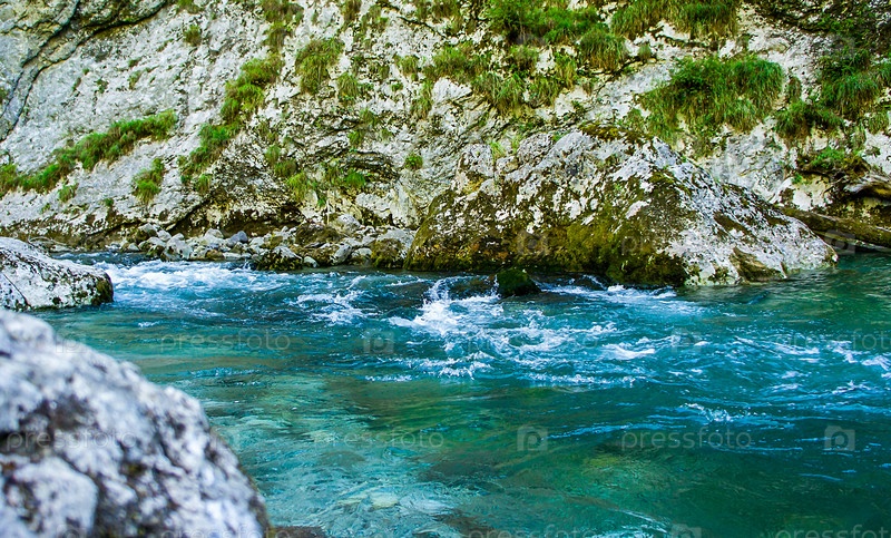 Скалистый берег горной реки с чистой водой