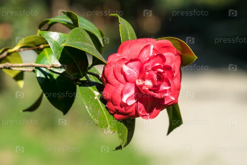 Розовый цветок камелии на размытом зеленом фоне