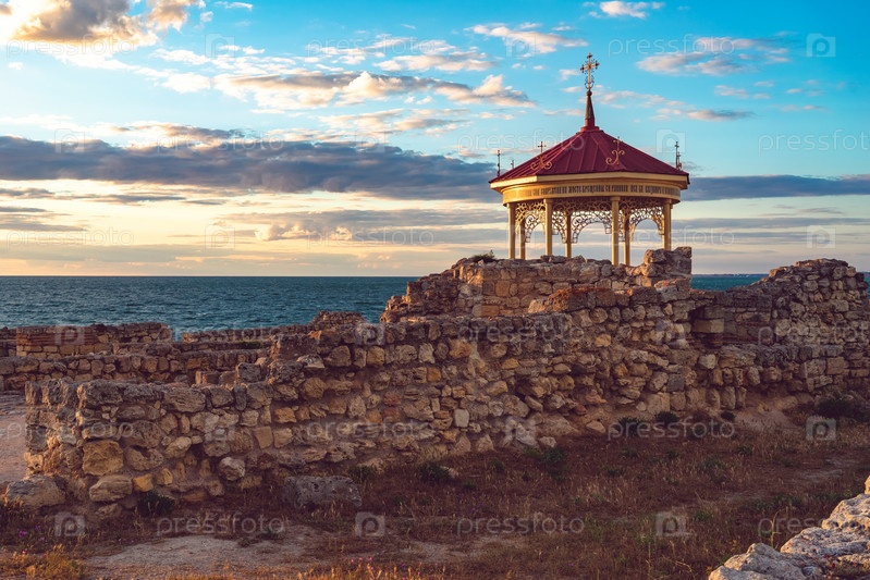 Красивый пейзаж с закатом и королевской беседкой на фоне морского пейзажа