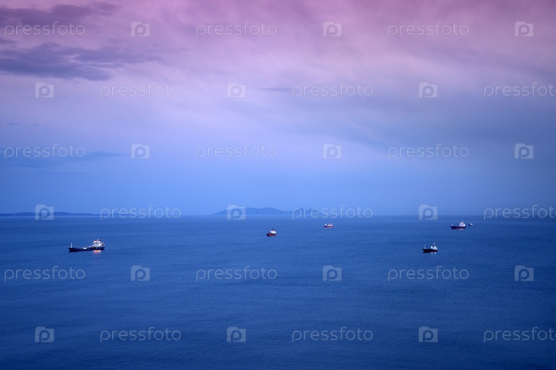 Морской пейзаж с кораблями под розовым закатом