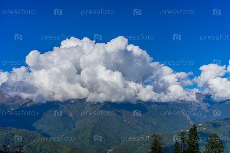 Горный пейзаж против облачного голубого неба в Красной Поляне Сочи