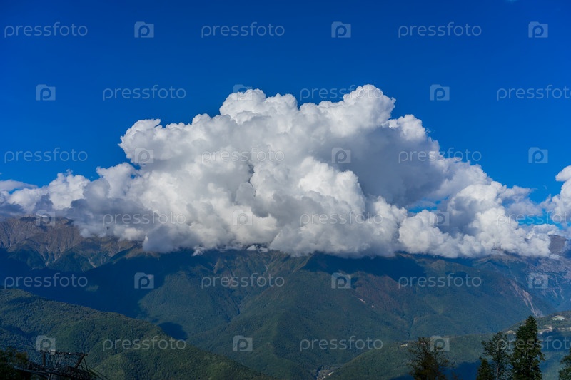 Горный пейзаж против облачного голубого неба в Красной Поляне Сочи