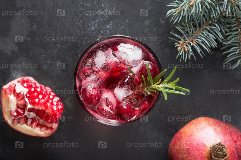 Гранатовый рождественский коктейль с розмарином, шампанским, содовой на черном фоне. Вид сверху