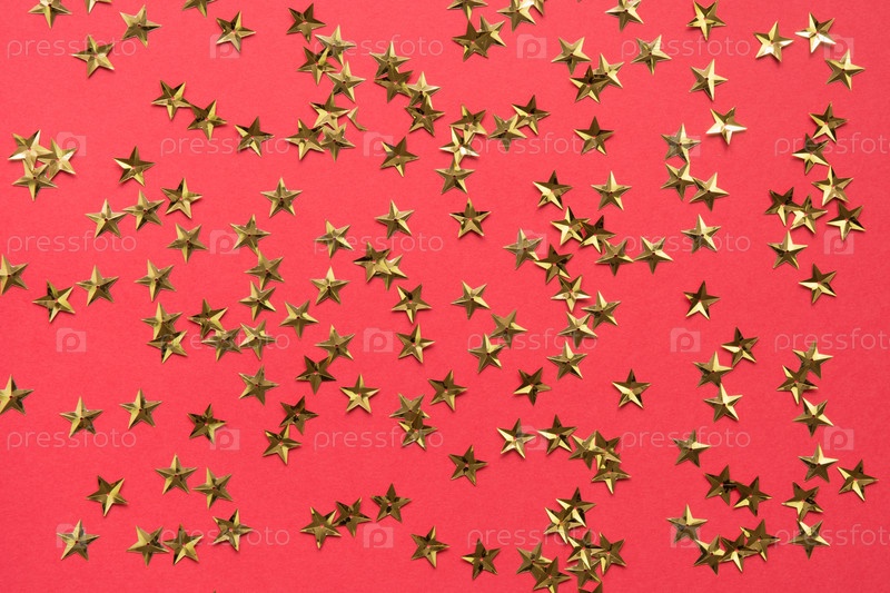 Золотые звезды блестят конфетти на красном фоне. Праздничный праздничный фон