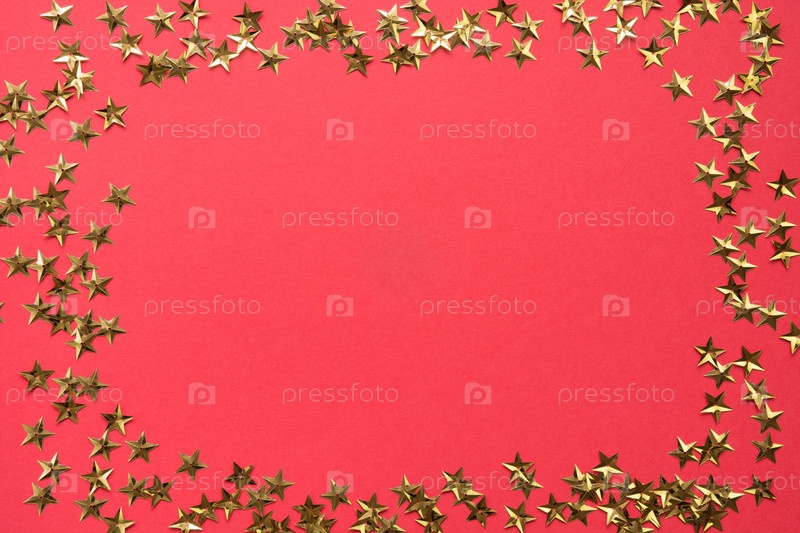 Праздничная граница золотых звезд блестит конфетти на красном фоне. Фон праздника Рождества