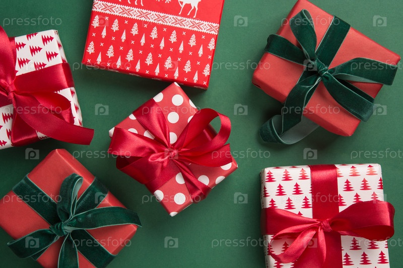 Рождественский образец праздничных подарков на зеленом фоне. День подарков. Открытка. Зима. С Новым Годом. Место для текста