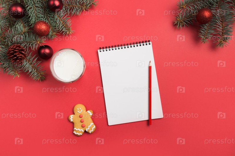 Рождественское письмо для Санта-Клауса с молоком, пряниками, печеньем на красном. Вид сверху и место для вашего текста. Плоская укладка