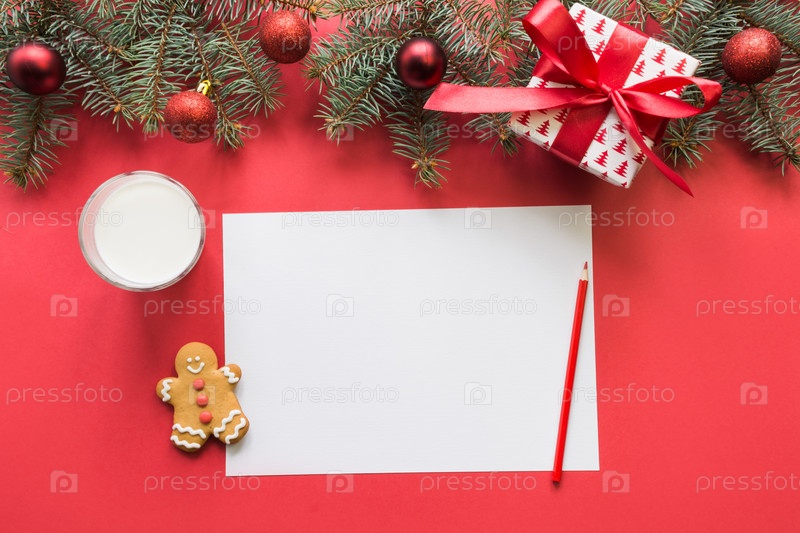 Рождественское письмо для Деда Мороза с молоком, печеньем, пряниками на красном. Вид сверху и место для вашего текста. Плоская укладка