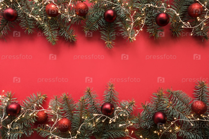Рождественская рамка с вечнозелеными ветвями, гирляндой, красными шарами, подарком на красном