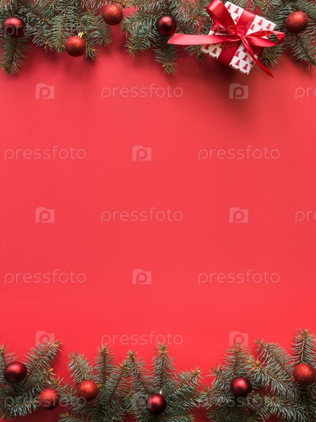 Новогодняя рамка с еловыми ветками, красные шары на красном