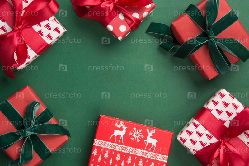 Рождественские подарки границы на зеленом фоне. День подарков. Открытка. Зимние каникулы. С Новым Годом. Место для текста