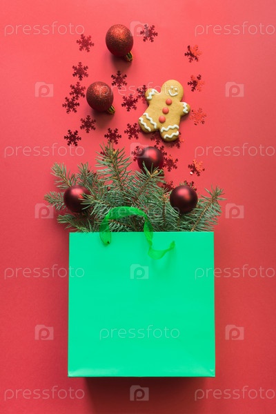 Бумажный пакет для рождественских покупок с пряниками и праздничным декором на красном фоне. Рождество. Вид сверху, плоская планировка