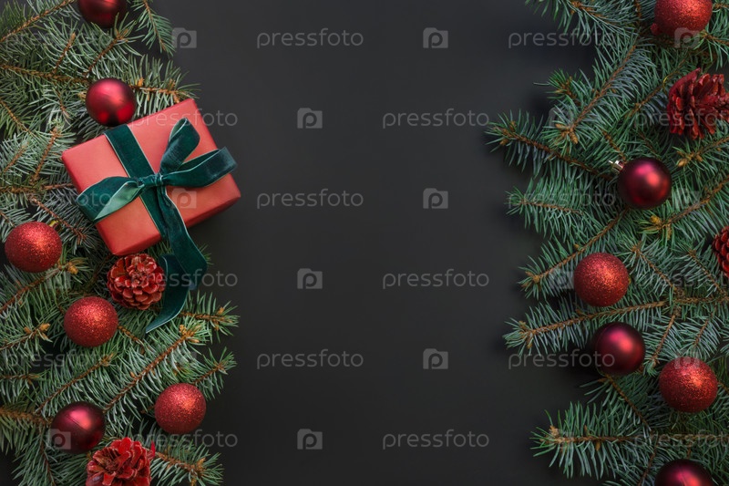 Рождественская рамка с подарочной коробкой, вечнозелеными ветвями, красными шарами на черном. Место для текста