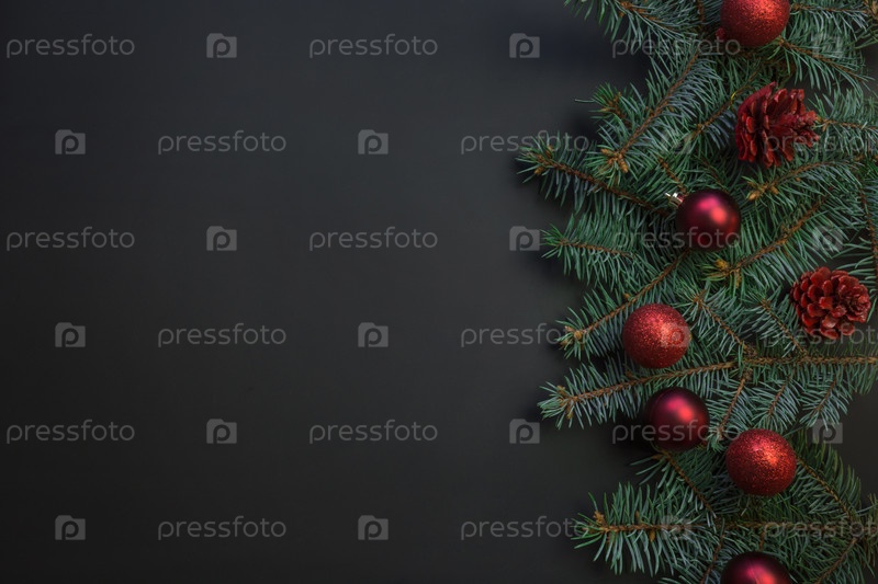 Новогодняя рамка с вечнозелеными ветвями, красные шары на черном фоне. Место для текста