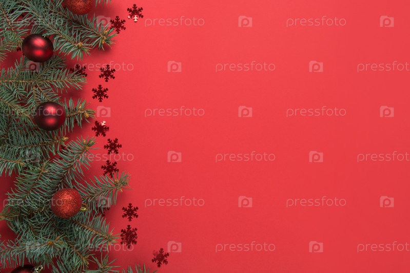 Новогодняя рамка с еловыми ветками и шарами на красном фоне. Открытка. С Новым Годом. Место для текста. Вид сверху. Плоская укладка