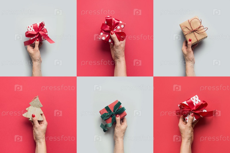 Женские руки держат разные подарки на сером и красном. Рождественская открытка. День подарков