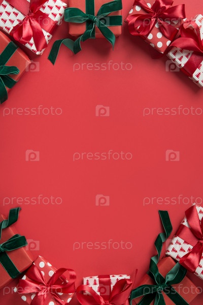 Рождественская граница праздничных подарков на красном фоне. День подарков. Открытка. С Новым Годом. Место для текста