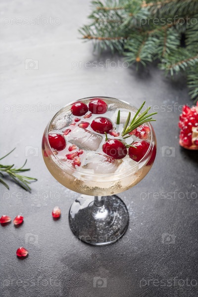 Гранатовый рождественский коктейль с розмарином, шампанским, содовой на черном фоне. Закрыть
