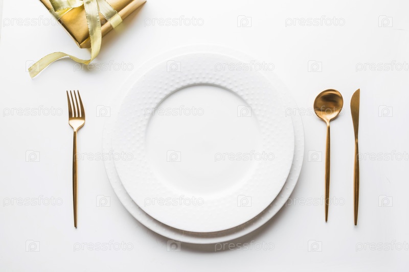 Элегантная сервировка стола с золотыми столовыми приборами на белом фоне. Вид сверху