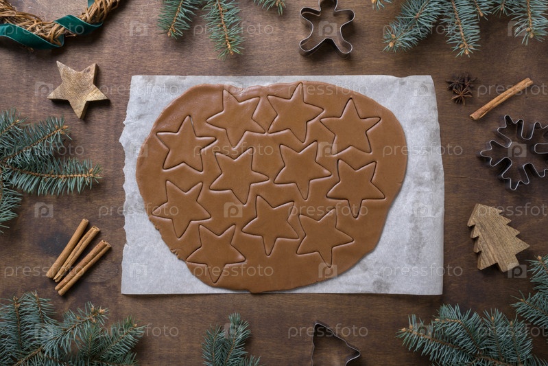 Свернутое пряничное тесто и формы для рождественского печенья на коричневом деревянном фоне. Процесс изготовления печенья ручной работы. Рождественский узор. Вид сверху