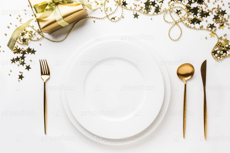 Сервировка рождественского стола с золотыми столовыми приборами и декором на белом фоне. Вид сверху