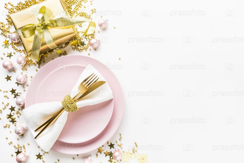 Сервировка рождественского стола с розовой посудой, золотое серебро на белом фоне. Вид сверху