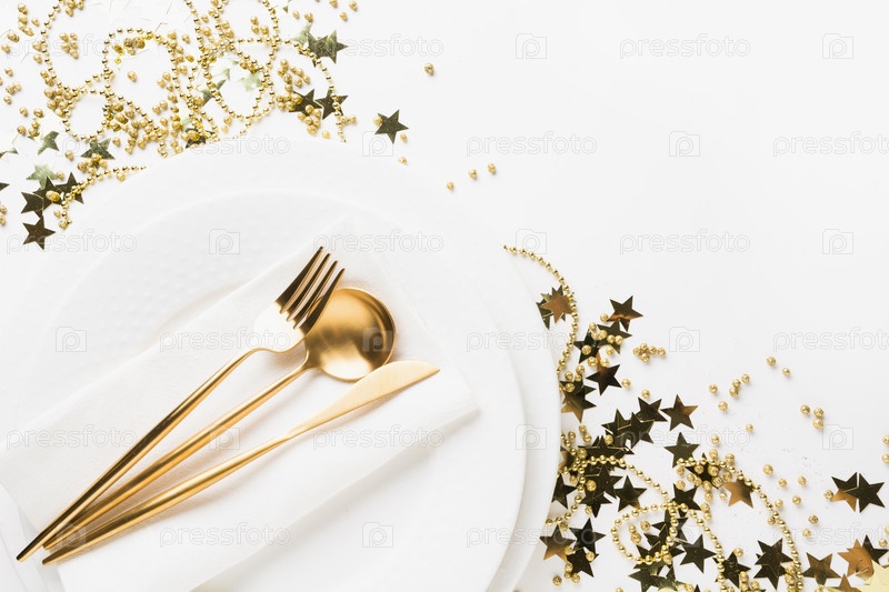 Золотая сервировка стола с блестящими звездами и бусинами на белом