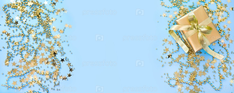 Рождественский баннер с роскошным золотым украшением и подарочной коробкой на пастельно-голубом. Плоская укладка. Вид сверху. Рождество