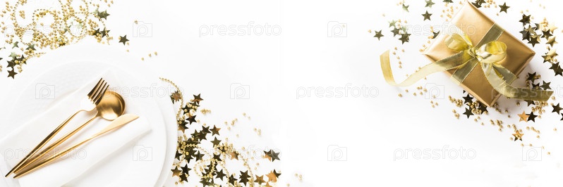 Сервировка рождественского стола с золотой посудой, столовое серебро на белом фоне. Вид сверху