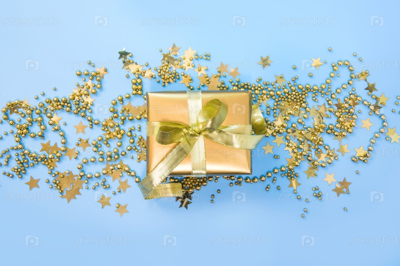 Роскошная золотая подарочная коробка на блестящем синем фоне. Рождественская вечеринка. Плоская укладка. Вид сверху. Рождество