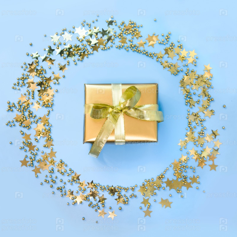Роскошная золотая подарочная коробка вокруг звездного конфетти в виде венка на голубом