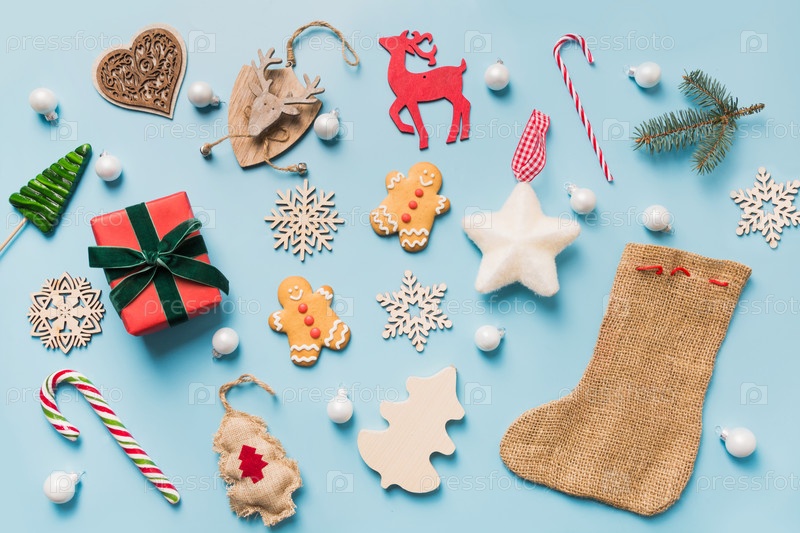 Рождественская коллекция с шарами, снежинками, оленями, леденцами, венком для макета. Шаблон, дизайн. Плоская укладка. Вид сверху
