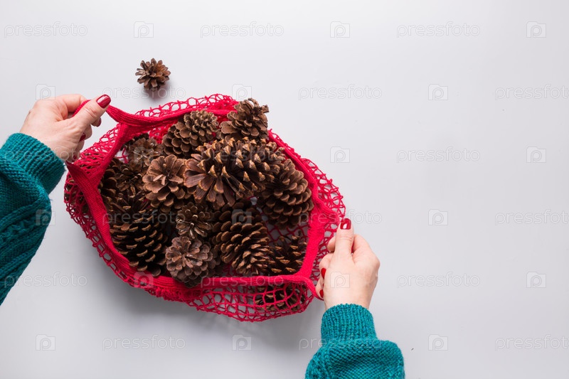 Женщина держит в руках сетчатый мешок с рождественским декором без отходов, натуральными конусами для подарков ручной работы и самодельного изготовления