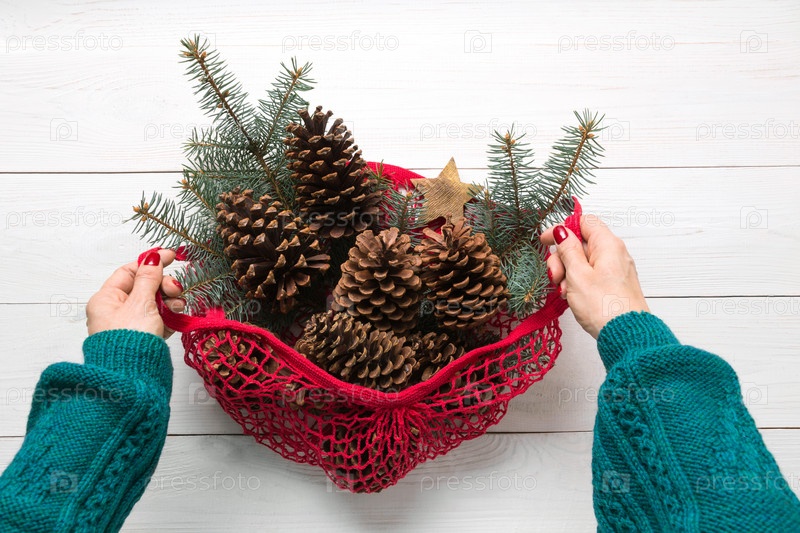 Женщина держит в руках сетчатый мешок с рождественским декором без отходов, натуральными конусами для подарков ручной работы и DIY
