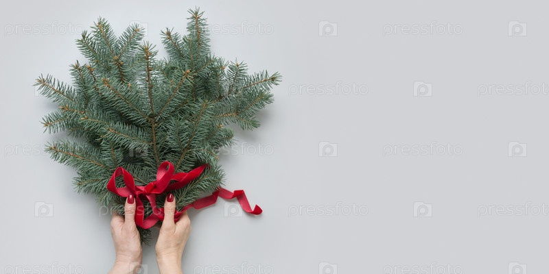 Женщина рука еловые ветки елки с красной лентой на сером. Рождественская открытка. Вид сверху. Креативная минимальная концепция