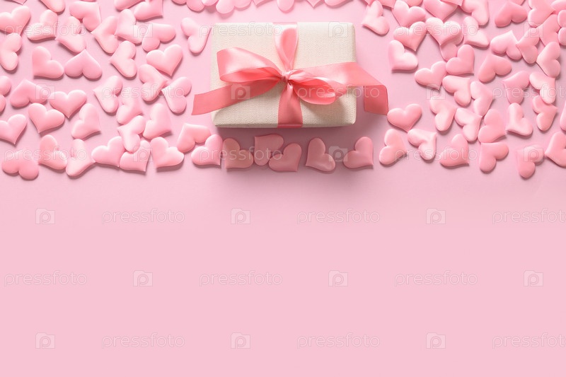 Подарок на день Святого Валентина и сердца на розовом фоне. Романтическая открытка с копией пространства. Баннер