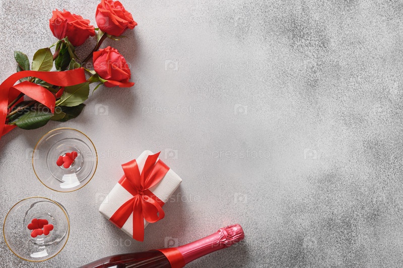 Открытка на день святого валентина с красными розами, романтическим подарком и игристым вином на сером фоне. Вид сверху. Скопируйте пространство