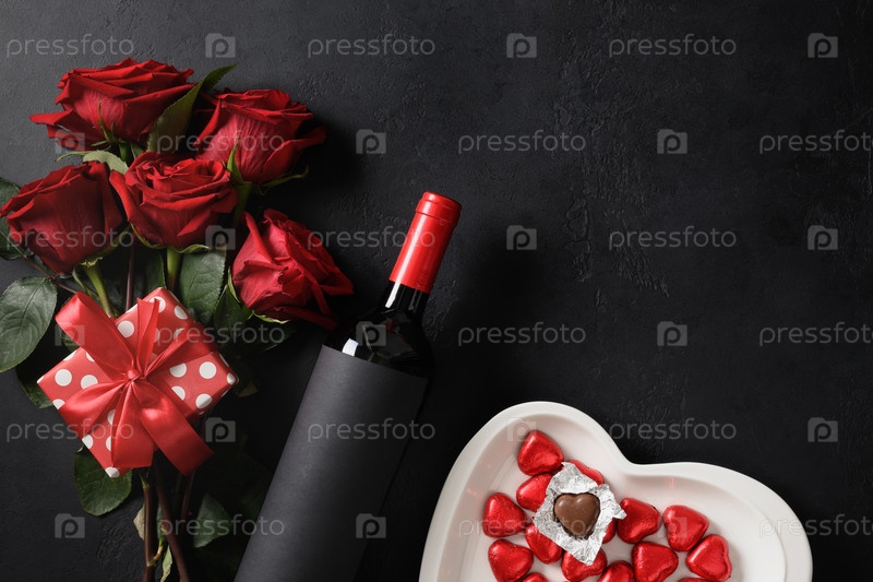 Букет красных роз и подарок. Открытка ко дню святого Валентина