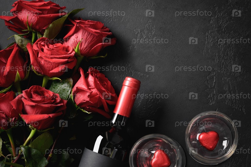 Открытка на день святого валентина с красным вином и букетом роз на черном фоне. Место для ваших поздравлений. Вид сверху