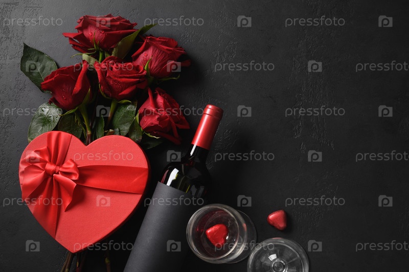 Букет красных роз и подарок. Открытка ко дню святого Валентина