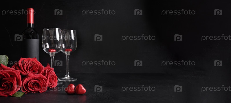 Баннер дня святого валентина с красным вином, букетом красных роз на черном фоне. Приглашение или открытка. Скопируйте пространство