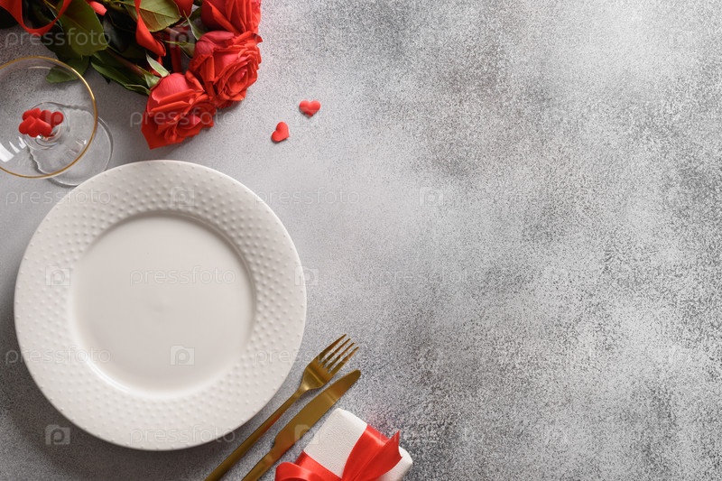 День святого валентина белая сервировка стола с подарком, красная роза на сером фоне. Вид сверху. Открытка. Приглашение на романтический ужин. Скопируйте пространство