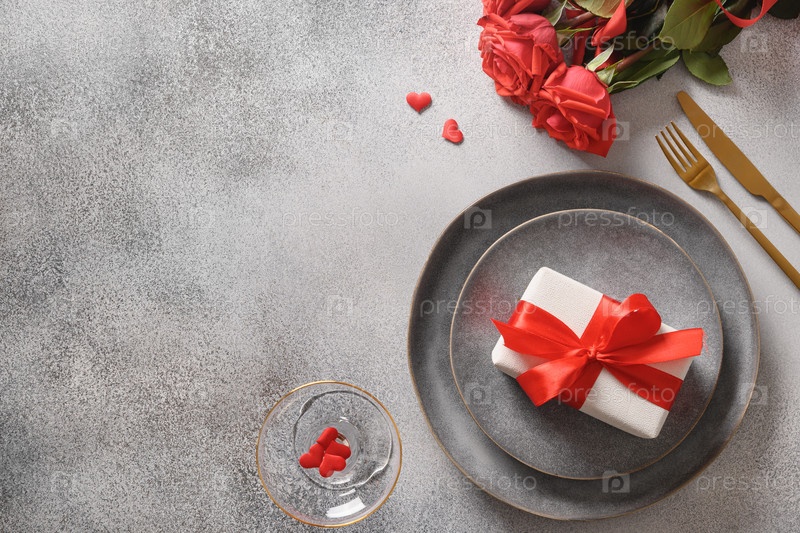 День святого валентина белая сервировка стола с подарком, красная роза на сером фоне. Вид сверху. Открытка. Приглашение на романтический ужин. Скопируйте пространство